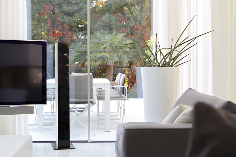 Per ottimizzare le performance energetiche, l’edificio è stato realizzato come un volume compatto distribuito su due piani fuori terra e uno interrato con una struttura in cemento armato dotato di uno strato tecnico isolante. Inoltre, le grandi aperture in vetro delle facciate sono state realizzate con pannelli triplo vetro per garantire un alto grado di isolamento termico e permettere il raggiungimento della classe A CasaClima. Seguendo la graduale pendenza del terreno, il piano terra della zona living grazie alle pareti vetrate e scorrevoli a tutta altezza trova un naturale collegamento con l’area relax della piscina e con il prato che circonda l’abitazione. L’orizzontalità e la trasparenza delle aperture scorrevoli è intervallata dai candidi volumi aggettanti del primo piano