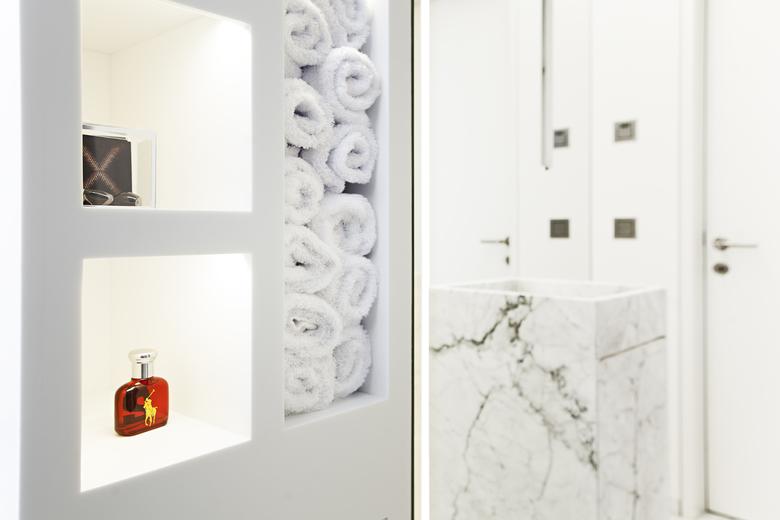 Gli interni sono dominati anch’essi dal bianco ottico delle pareti, degli arredi e delle superfici lucide in marmo che ampli- fica la vastità degli spazi. La struttura in cemento armato ha permesso infatti di evitare divisioni murarie interne sostituendole con pareti in vetro opaco e trasparente e un sistema di tende mobili che permette di ottenere gradi diversi di separazione e di privacy.