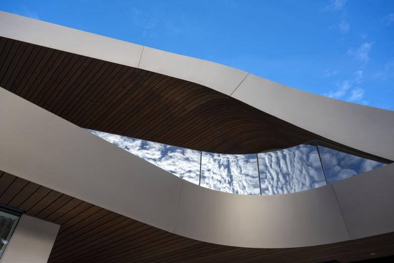 Inside, the spiral staircase in metal and wood that connects the ground and first floors is topped by a large oval skylight, clearly visible in the zenith view as symbiotic relationship between light and matter.