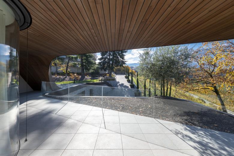 Outside, the glassed façades with large sliding doors on both floors provide access to the outside from almost every corner of the house: on the first floor to the covered terrace and on the ground floor to the garden that surrounds and wraps around the house up to the "infinity pool" facing the valley that leads from Bolzano to Merano.