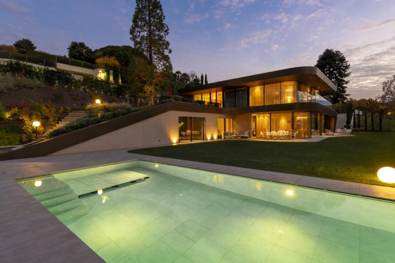 This is the scenery in which Villa EB is set. Villa EB is a semi-detached residence created after a complex renovation of a old villa built in the early 1960s. Although the previous residence had high living standards and it was built with top-quality materials and finishes, it however showed all the limitations of a house designed according to the canons of the time, for example: a very closed envelope, with a very low ratio between glass surfaces and solid walls, with few views of the landscape and very low ceilings.