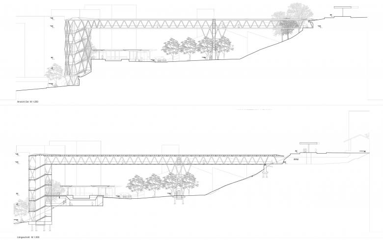 gegenüber der Passerelle leicht abgedreht. Der Sockel des Turms wird beidseitig in einer Böschungsmauer fortgesetzt. Darin sind zwei Nutzungen integriert eine Veloabstellanlage (ca. 54 Plätze) und ein kleiner Blumenladen mit Café, welcher auch dem vis-à-visliegenden Friedhof dient.