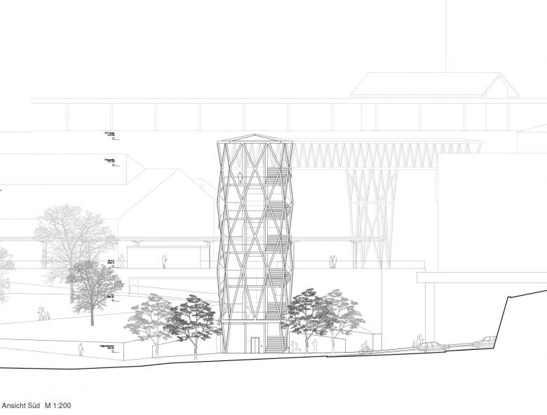 Die Lage des Turms in unmittelbarer Nähe zum Perron erlaubt es, die beiden Niveaus der Personenunterführung und des Perrons auf direktem Weg zu erreichen. Anstelle einer zweiten Treppenverbindung findet auf dem Perron die Wartehalle Platz. Im Zentrum des Turms steht der 2-seitig transparente Liftkern. Die Treppe führt um diesen Kern herum, so dass der Fokus stets auf der Aussicht bleibt und der Auf- beziehungsweise Abstieg zu einer gleichbleibend kurzweilig zu begehenden Promenade wird. Auf dem obersten Niveau wird die Passerelle leicht ausgeweitet. Den Passanten bietet sich seitlich eine spektakuläre Sicht über St.Gallen, ohne dass dadurch die Zugänge zur Treppe oder zum Lift behindert werden.