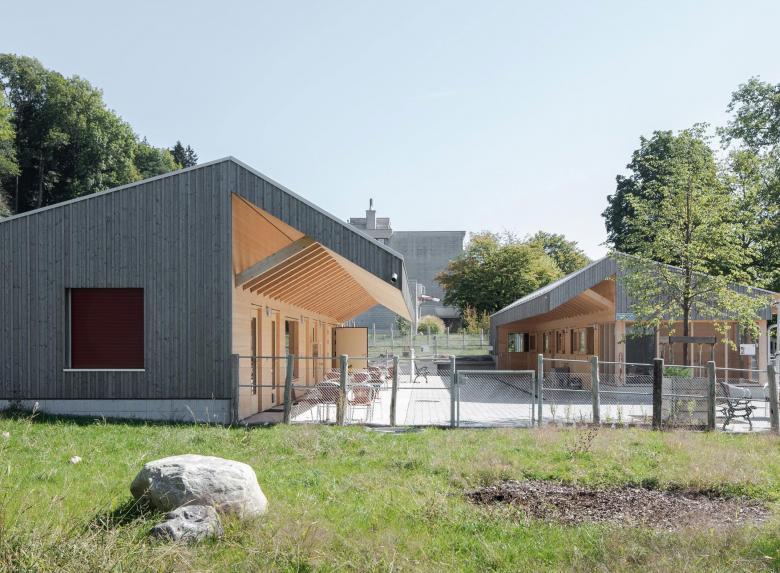 Two wooden buildings form a farm-like ensemble. The arrangement of the buildings parallel to the slope follows the concept of the existing campus from the 1970s. The order of longitudinally oriented buildings shifted towards each other can also be found in the retaining walls on the steep slope at the back of the complex.