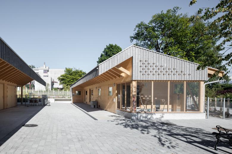 Prägendes Element für den architektonischen Ausdruck sind zwei, sich gegenüber-liegende Dächer, die auch den Aussenraum grosszügig vor Witterung schützen und ein vielfältiges Angebot an barrierefreien Aufenthaltsbereichen ermöglichen. So wird, mit architektonischen Mitteln, ein Gefühl von Geborgenheit und ein geschützter Rahmen für die Bewohner geschaffen.