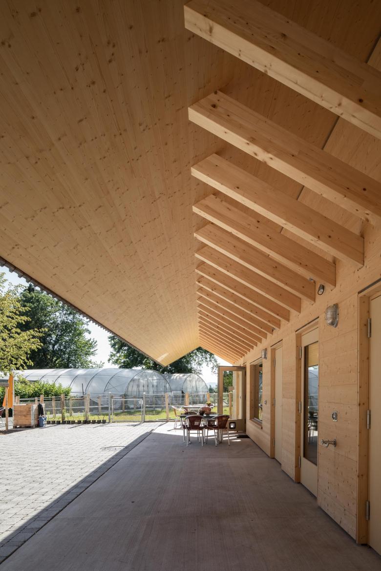Zwei Holzbauten bilden ein bauernhofartiges Ensemble. Die Anordnung der Baukörper parallel zum Hang folgt dem Konzept des bestehenden Campus aus den 70er Jahren. Die Ordnung zueinander verschobener, längs gerichteter Baukörper findet man auch in den Stützmauern im steilen Hang im Rücken der Anlage.