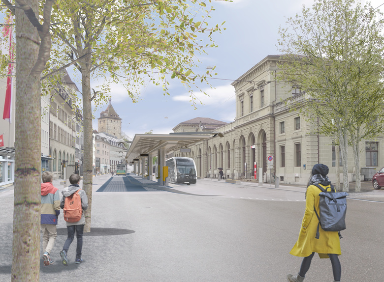 Mit der Setzung des Busperrons und seiner Überdachung in der Mittelachse der Bahnhofstrasse erhält der Stadtraum eine Zentrierung, welche die flankierenden Gebäudefassaden freispielt und wieder in Wert setzt. Die Mittelinsel löst das Problem des monofunktionalen Stadtraums und fordert gleichzeitig heraus. Mit einem eigenständigen Platzbelag, welcher sich zwischen den strassenbestimmenden Fassaden aufspannt, wird die Ausdehnung des Miteinanders von Bus- und Langsamverkehr definiert. Über das topographische Element der Perronkante sowie über fassadenparallel verlaufende Ausstattungselemente werden zudem geschützte, ausschliesslich den Fussgängern vorbehaltene Bereiche ausgezeichnet. Der ansonsten niveaugleiche Belag aus gegossenen Ortsbetonflächen ist grosszügige Querungsbrücke, Umsteigedrehscheibe und Stadtplatzträger zugleich. Grund, Zentrum und «alte» Raumkanten bestimmen den neuen, selbstbewussten Bahnhofsplatz.