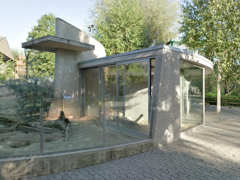Es entsteht eine tiergärtnerisch vorbildliche und für die Schweiz einzigartige Erdmännchenanlage, in der die Tiere artgerecht gehalten werden können. Die 110 m2 grosse Aussenanlage weist über die ganze Fläche eine Grabtiefe von 1,5 m auf. Die Erdmännchen legen darin unterirdische Gänge und Bauten an, ein spezielles Sandgemisch sorgt für das entsprechende Baumaterial. Über Steininseln sind Wärmelampen platziert. Dies erlaubt es den Tieren, sich auch bei kühleren Temperaturen im Freien aufzuhalten. Die vorhandene Betonkragplatte bietet zudem einen minimalen Regenschutz. Die spärliche Bepflanzung ist dem natürlichen Habitat der Erdmännchen nachempfunden. Ein Teil der bestehenden Umfassungsmauer wird durch eine 1,2 m hohe Glaswand ersetzt. Im rückwärtigen Teil der Anlage ermöglicht ein zusätzliches Fenster, die Tiere auch unter Terrain beim Graben zu beobachten. Das Winterquartier beherbergt mehrere Gehege, die es erlauben, einzelne Tiere oder Gruppen zu separieren. Der 11 m2 grosse Innenraum ist isoliert, beheizbar und natürlich belüftet. Eine Besonderheit bildet der Wintergarten mit Besonnungsanlage: Er bietet den Tieren auch bei kalter Witterung einen behaglichen Raum, der für die Besucher einsehbar ist.