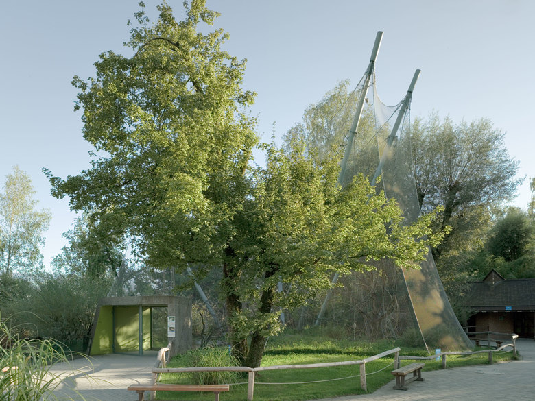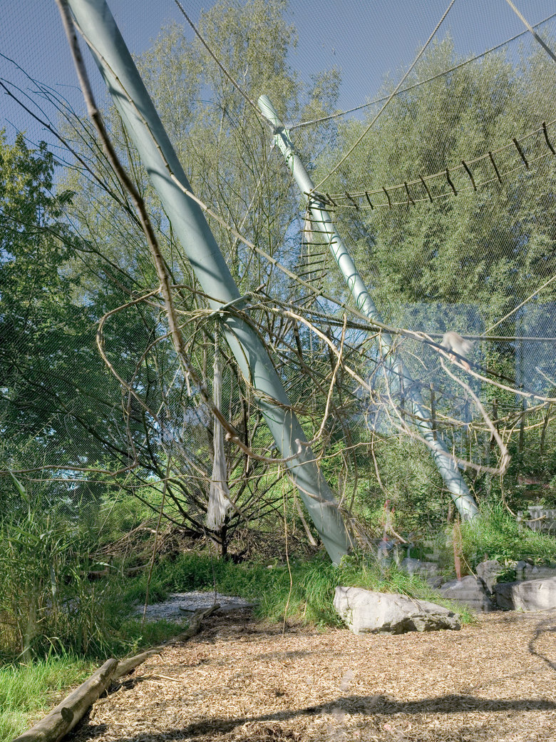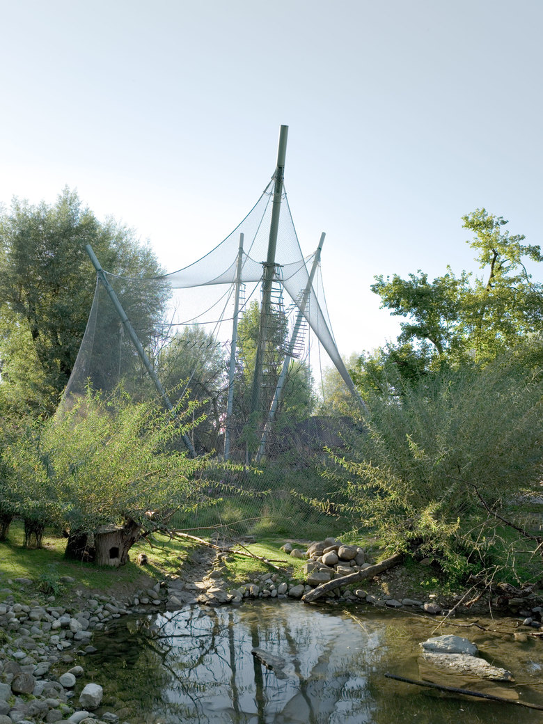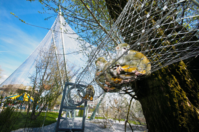 Die hohe, schwungvolle Übernetzung der Totenkopfaffen-Anlage lockt die Besucher in den hintersten Bereich des Kinderzoos und verleiht dem ganzen Gebiet neues Leben. Die ausdrucksstarke Zeltform legt sich zwischen die bestehenden Bäume. Die Konstruktion besteht aus vier, schräg stehenden Stahlpylonen, über die ein Chromstahlnetz gespannt wird. Es ist gleichzeitig die erste Zooanlage mit dem Webnet der Firma Jakob AG.