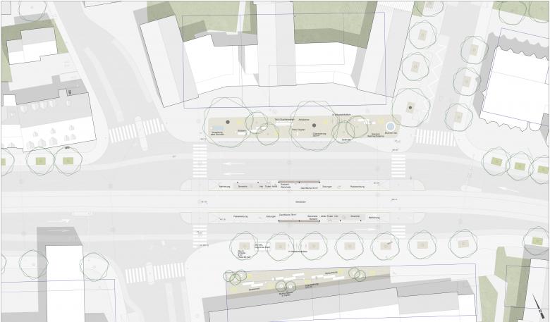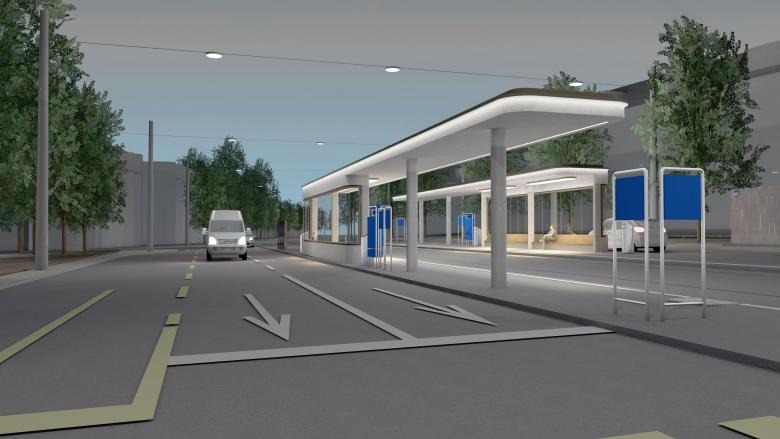 Zwei offene Wartehallen stehen sich gegenüber und spannen über die Tramgleise hinweg einen Raum auf. Ihre seitliche Abschlüsse beziehen sich aufeinander. Gemeinsam markieren sie das räumliche Zentrum des Zehntenhausplatzes. Für die Dauer der Umsteige- beziehungsweise Wartezeit wird durch das Zusammenspiel der beiden Hallen ein geschützter Aufenthaltsort mitten im pulsierenden Strassenverkehr gebildet – zwei Anlegestellen für Tram und Bus inmitten des steten Verkehrsflusses des MiV. In die jeweilige Fahrtrichtung des Verkehrs weiten sich die Perrondächer. Mit ihrer Länge von über 26.0 Metern schützen die ein- und umsteigenden Fahrgäste entlang der Haltekante zuverlässig vor der Witterung und versetzen die Haltestelle und den gesamten Platz in dynamische räumliche Bewegung.