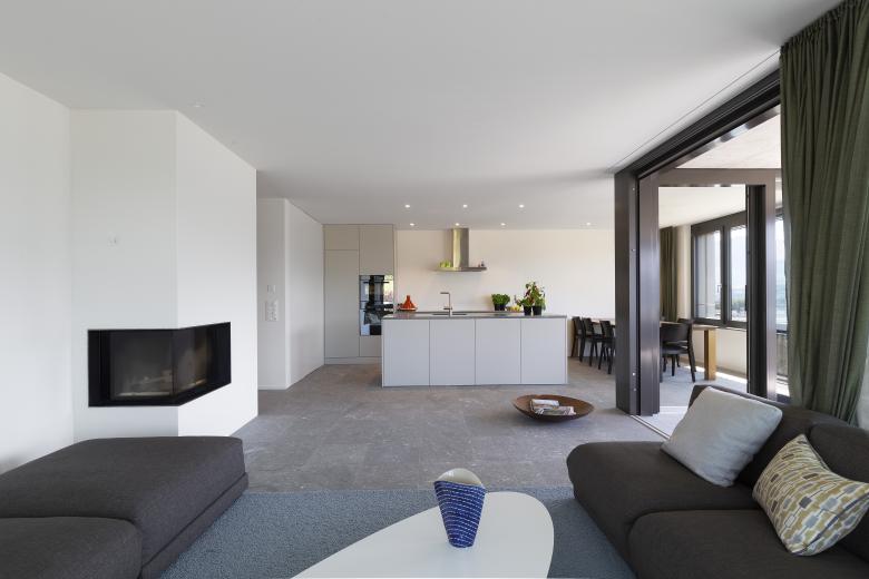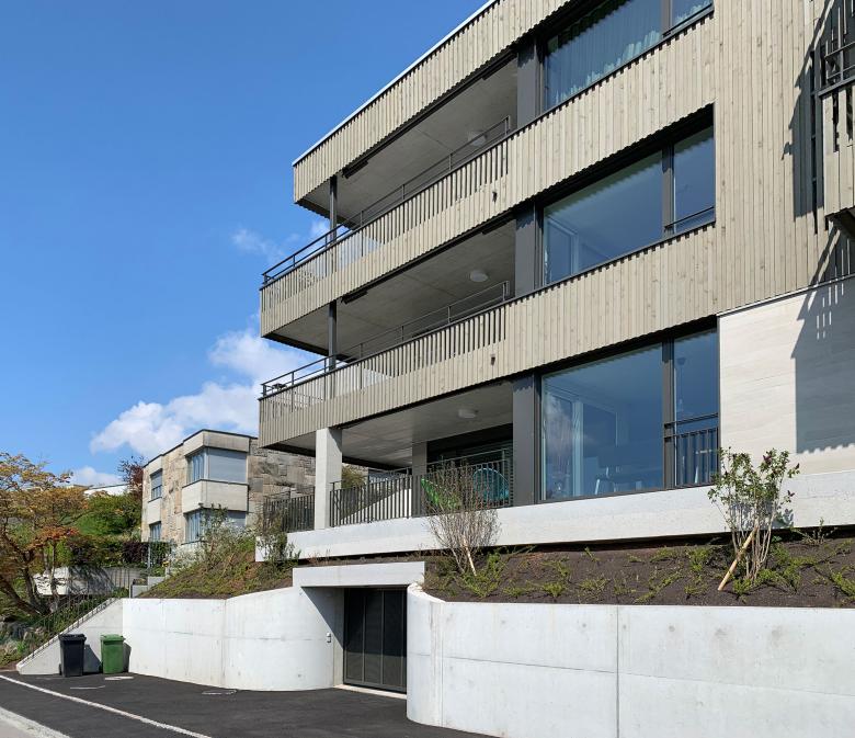 So entstanden zwei Häuser mit je fünf Wohnungen und einer gemeinsam genutzten Parkgarage. Die grosse Qualität an dieser Hanlage ist die grossartige Aussicht, von der jede Wohnung profitiert. Die Gestaltung von Erschliessung und Parkierung ist hingegen – lagebedingt – als anspruchsvoll zu bezeichnen. Das eine Wohnhaus ist von der unteren Zufahrtsstrasse her erschlossen, während andere Haus von der oberen, hangseitigen Strasse erreicht wird. Über eine Promenade Architecturale werden sie miteinadner verbunden, so dass man trockenen Fusses - ohne Treppen laufen zu müssen – von der Einstellhalle des unteren Hauses bis in die Attikawohnung des oberen Hauses gelangt. Die Mietwohnungen sind klassisch geschnitten und zwischen 100 und 150 Quadratmeter gross. Damit man von jedem Zimmer aus die See- oder Bergsicht genissen kann, wurde der Erschliessungskern an die Nord- und Hangseite gelegt. Etwas Besonderes sind die grosszügigen Terrassen, welche jeweils um die ganze Wohnung herumführen und über welche praktisch jede Wohnung einen direkten Gartenzugang erhält – ein weiterer Vorteil der Hanglage.