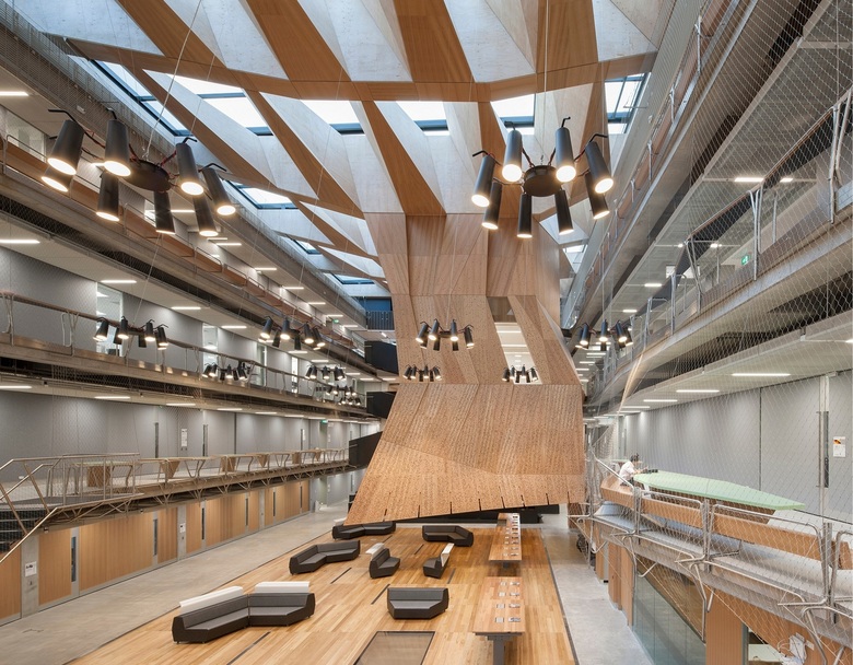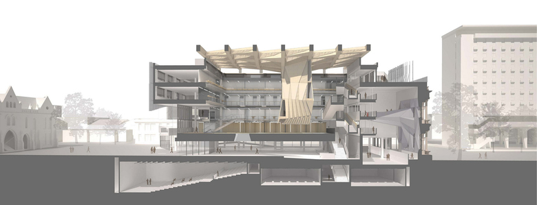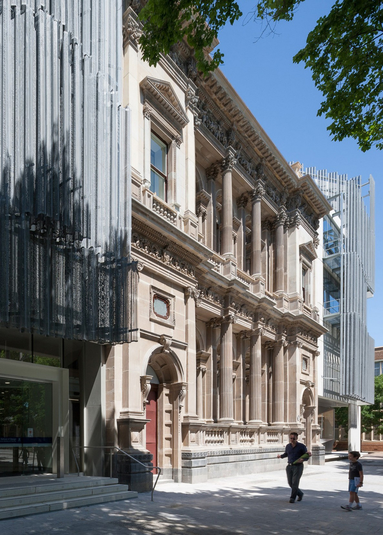 Following an international design competition JWA and NADAAA were appointed as architects to design the new Melbourne School of Design building for the University of Melbourne. The University embraced the unusual creative relationship proposed between the two practices as collaborative design partners across all aspects of the project. The project integrates the requirements of both the University’s Property and Campus Services and the Faculty. The design process has involved regular briefing meetings, workshops and presentations with various faculty user groups, University Committees and Reference groups. The building design responds to the planning principles set out in the 2008 University of Melbourne Parkville Campus Master Plan. The building design meets its briefed area and budget targets, comprising of 6 levels (basement plus five levels) and incorporates two lecture theatres, workshop, library, two exhibition spaces, cafe, a series of studios over three levels, a studio hall, and a series of associated academic and professional workspaces captured within the briefed 15,772 m2 GFA. Central to the design is the Studio Hall, a large flexible space that provides for informal occupation over all times of the day. The Studio Hall is enclosed to the west side by the former Bank of New South Wales façade, and to the east side the Studio Hall overlooks the new courtyard. It is spatially book ended at the east side by the heritage façade of the Elisabeth Murdoch building. The Studio Hall is enclosed by a coffered timber roof that mediates natural daylight and assists natural ventilation. The building has been designed to incorporate a number of innovative structural and services systems that combined with the building’s façade system contribute to achieving the targeted 6 star green star rated building.