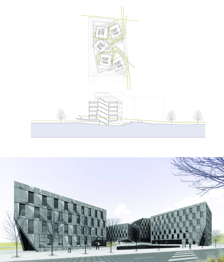 Within Ordos, a new city in the Dongsheng District of Inner Mongolia, NADAAA has designed an office park in collaboration with Himma. Subject to extremely tight regulation, and operating without an immediate context, the plot assigned to the architects was zoned for multiple cubic volumes, all designed as speculative office spaces.