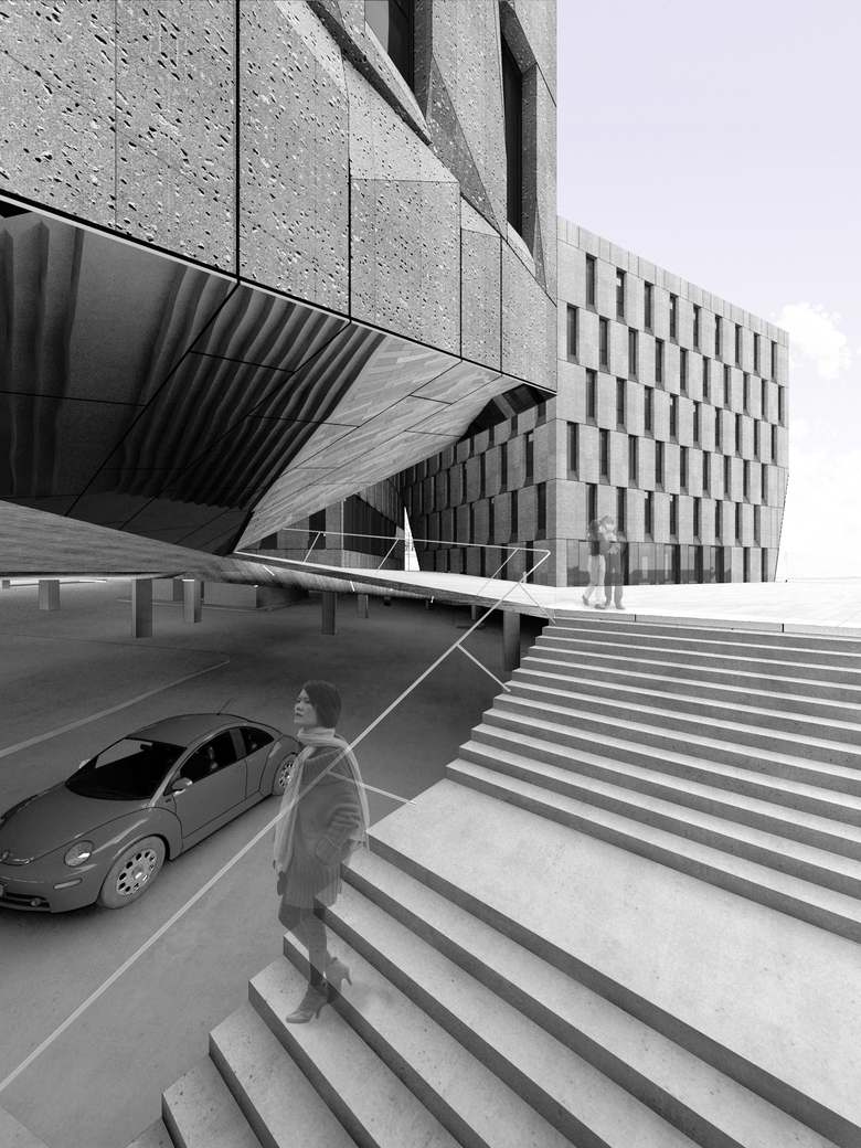 Clad in a local stone, the buildings have a pumice-like roughness which contrasts directly with the delicacy of entries and openings once they are revealed through the carefully controlled “slicing” of the cubes. Panels of stone are arrayed on the facade, producing a language of rhythmic openings, which themselves become part of a more finely grained differentiation of workspaces.