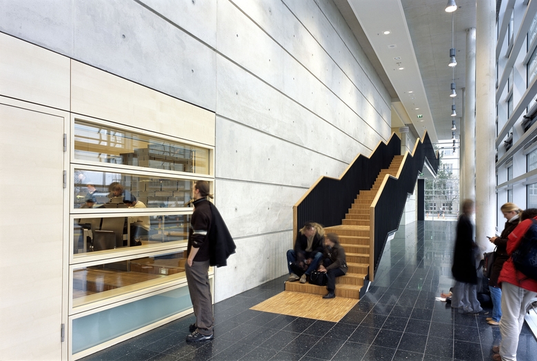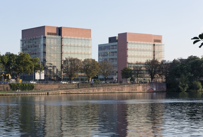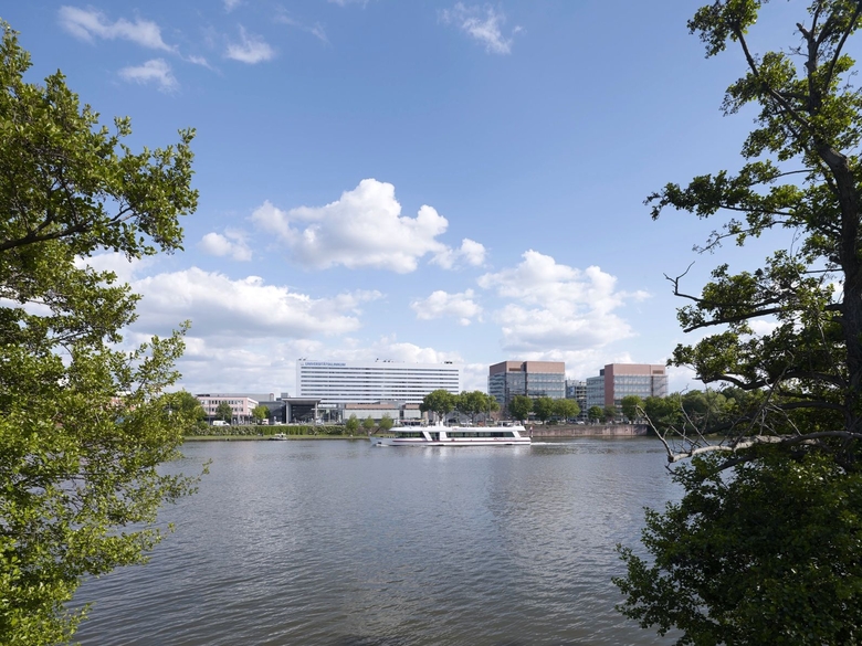 In ihrer städtebaulichen Struktur ist die gesamte Anlage zum Main ausgerichtet. Ein neues Forschungsgebäude sowie ein neues Hörsaalgebäude als zentraler Ort für Lehre, Forschung und Wissenschaft begrenzen den sich zur Uferpromenade hin öffnenden Campus. Ein Vordach verbindet die Bauteile und verweist auf die großflächig verglaste Eingangshalle, welche die Schnittstelle zwischen Universitäts- und Krankenhausbetrieb bildet. Hier beginnt die so genannte ‚Magistrale’, an die sich die einzelnen Untersuchungseinheiten pavillonartig aneinanderreihen.