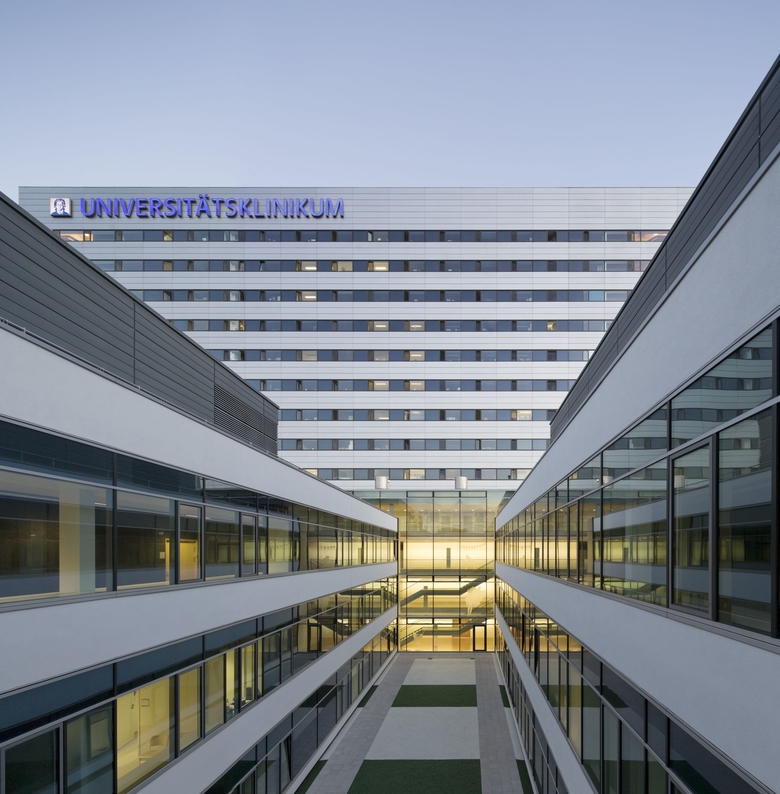 Die jüngste Maßnahme am Universitätsklinikum ist die Sanierung der Bettenhausscheibe und des Zentralgebäudes Haus 23 bei laufendem Betrieb. Die weithin präsente Bettenhausscheibe sollte nicht nur die energetischen Erfordernisse erfüllen, sondern auch zeitgemäßen gestalterischen Ansprüchen gerecht werden. Die Erneuerung der Fassade des im Betrieb befindlichen Bettenhauses bildete eine logistische Herausforderung und erforderte, wie auch die Maßnahmen in den Sockelgeschossen, vielfältige Interimslösungen. Die Sockelgeschosse wurden vollständig entkernt und durch einen Neueinbau vervollständigt. Hierin befinden sich drei Zentren der inneren Medizin und eine Unfallchirurgie. Die neue Eingangshalle bildet die Schnittstelle zwischen Universitäts- und Krankenhausbetrieb sowie zwischen Neubau und Bestand, beinhaltet die Service- und kommunikativen Einrichtungen und leitet Patienten und Besucher über die eingegliederten Magistralen in das Gebäude.