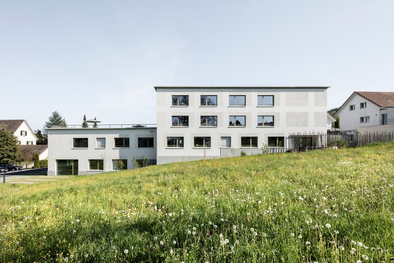 Das Wohnheim Breite liegt östlich des Dorfkerns in einer ortsbaulichen Situation, die sich durch das Ineinandergreifen von Landschaftsraum und ländlicher Bebauungsstruktur auszeichnet. Das bestehende herrschaftliche Wohnhaus besetzt die südliche Parzellenecke und bildet in einer unaufdringlichen Art und Weise die Adresse des Wohnheimes. Der Erweiterungsbau wird in der zweiten Bautiefe des Grundstückes positioniert, so dass bestehende Ausblicke in die nähere Umgebung erhalten und die allseitige Orientierung des Bestandes unbeeinträchtigt bleiben. Das mehrfach gestaffelte und abgetreppte Neubauvolumen folgt in seiner Höhenentwicklung dem Terrainverlauf, womit eine der Situation angemessene Körnung und eine differenzierte Verteilung der Baumasse erreicht werden kann. Durch das Einbetten der Baumasse in die fallende Topografie entsteht eine Abfolge von unterschiedlich bespielbaren Plateaus, die den jeweils angrenzenden Nutzungen zugeordnet werden. Ein ostseitig raumhoch freigespieltes Sockelgeschoss umfasst die atelierartig konzipierten Räume der Beschäftigungsstätte, einen zentralen Aufenthaltsraum, sowie Physiotherapie- und Infrastrukturräume. Es bildet die archtektonische Basis für die darüberliegenden Wohngeschosse. Zwei Intensivwohngruppen werden im Erdgeschoss über einen inneren Verteilraum erschlossen, der eine Schleusenfunktion übernimmt und betrieblich verschiedene Nutzungszustände ermöglicht. Ein räumlich differenzierter Korridor mündet in die an den Gebäudeenden angeordneten Wohn- und Essräume, welchen wiederum die geschützten Aussenräume vorgelagert sind. Die Obergeschosse beherbergen zwei identische reguläre Wohngruppen, deren Wohn- und Schlafbereiche sich jeweils um einen zentralen Infrastrukturkern organisieren. In das Gebäudevolumen eingezogene Loggien erweitern die offenen Raumstrukturen der räumlich grosszügig ausformulierten Wohn- und Essbereiche.