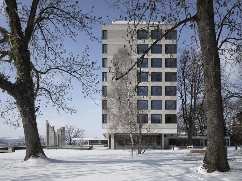 Das 1962-65 von den Architekten Schütz und von Meyenburg erbaute Pflegezentrum liegt in Höngg, auf einem Plateau mit grossartiger Aussicht über das Limmattal. Das mehrteilige Gebäudeensemble verfügt über eine hohe städtebauliche und architektonische Qualität und ist ein eindrücklicher und gut erhaltener Zeuge der Architektur der sechziger Jahre. Der Gebäudekomplex setzt sich aus dem talseitig sichtbaren Sockelgeschoss, dem freien Erdgeschoss und dem darüber schwebenden Bettenhaus zusammen. Ein aufgrund des Alters der Bausubstanz umfassender Erneuerungsbedarf machte eine Gesamtinstandsetzung erforderlich. Die vorgefundenen räumlichen Qualitäten zu schärfen und die im Bestand angelegten Material- und Farbstimmungen weiterzuentwickeln, stand in der Projektentwicklung im Zentrum des architektonischen Interesses. Im Sinne einer räumlichen und konzeptuellen Klärung wurde der bestehende Fassadenverlauf im Erdgeschoss vereinfacht. Eine filigrane, von Glas geprägte Hülle spannt unter dem markanten Volumen des Hochhauses zwischen die zwei flankierenden Betonkörper und akzentuiert das bereits im Bestand angelegte Thema des fliessenden Raumes zwischen Innenraum und Umgebung.