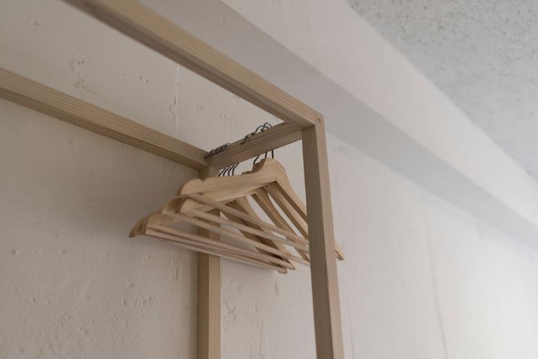 余分な仕上げを外した上で、地元の木材を35mm角に製材し、機能的なボックスフレームのみで構成している。そのフレームは、必要最小限の機能を果たしつつ、リズミカルな空間を生み出している。