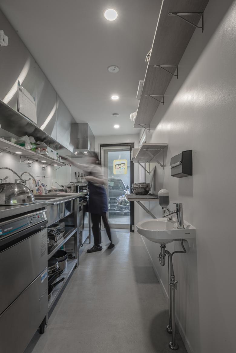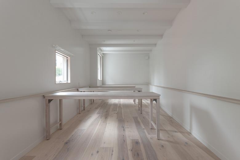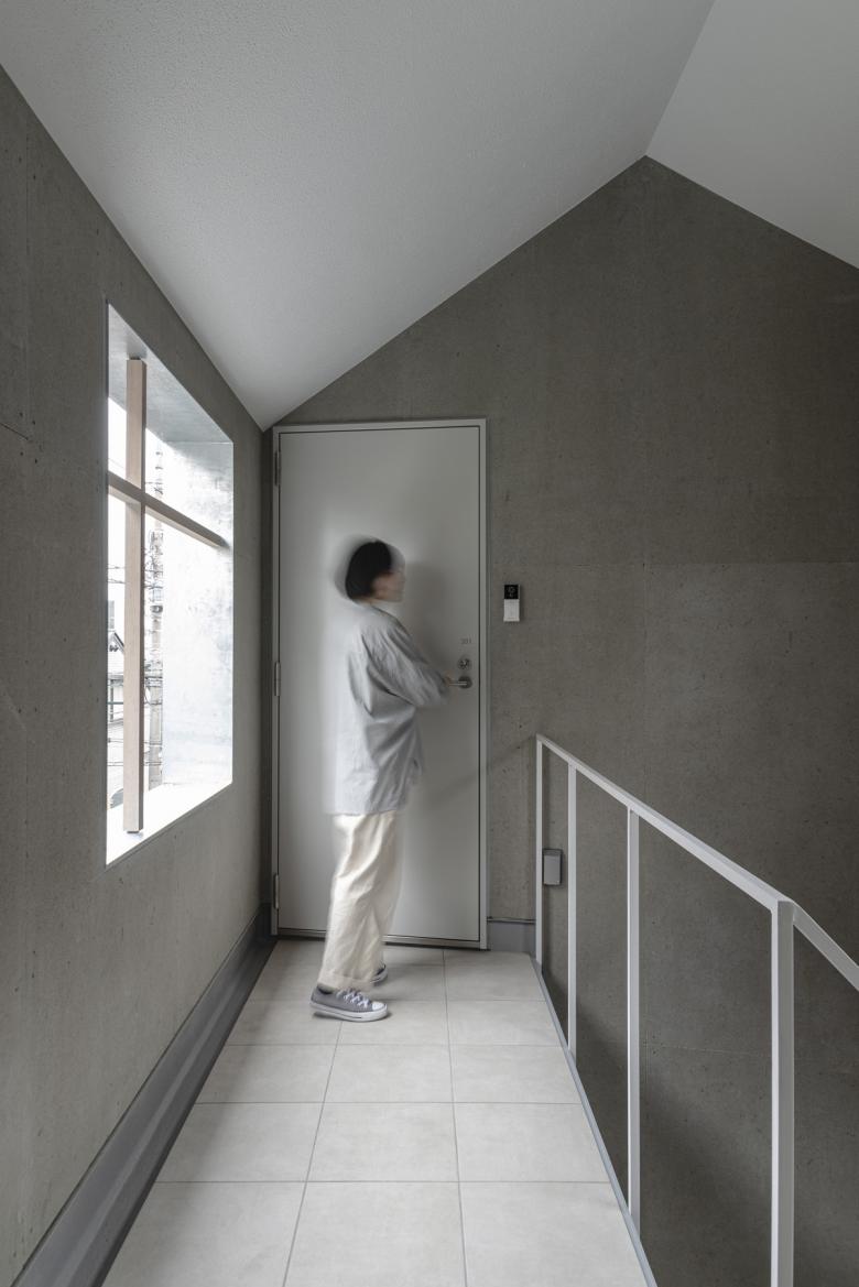 また、共有広場では、キッチンで作ったお弁当の販売やマルシェなど、住人だけでなく周辺の方々とのコミュニティの場ともなっている。階段室や共有広場の壁が斜めに空間を切っているのは、道路に対して広がりを持たせ、狭小でありながらも、周辺への閉鎖感を緩和させる効果に期待するとともに、居室にも奥行感や広がりを感じさせる効果ともなっている。