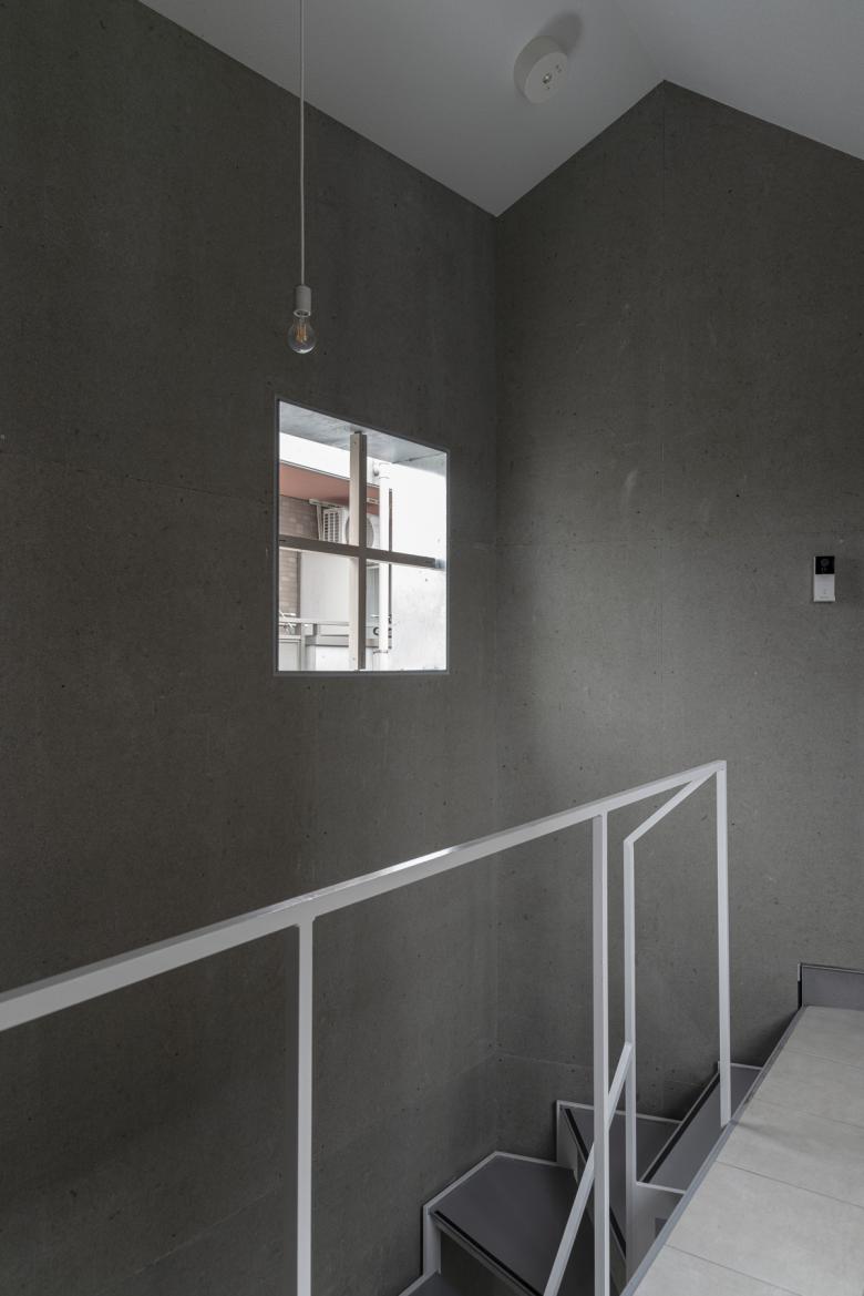 奥行きがなく、各階共に横への動線が取れない為、縦同線(階段)を2つ設けることで、横動線を最初限に抑えている。