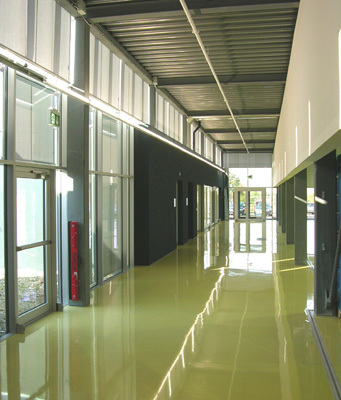 Produktion mit bläulichem Glas und Aluminiumverkleidung, Lager mit geschlossener Aluminiumverkleidung, Bürogebäude dunkelblau verputzt und Verbindungsstrasse voll verglast. Das Nebeneinander wird mit einer Schichtung von geschlossenen und verglasten Flächen und von präzisen, horizontalen Abdeckbändern zu einem Ganzen verbunden. Zusammen ergibt sich ein harmonischer Farb- und Materialklang. Der durchgehende zitronengelbe Kunststoffboden schafft einen wohltuenden Kontrast zur kühlen, äusseren Erscheinung des Gebäudes und reflektiert das Licht als Warmton auf Wände und Decken.