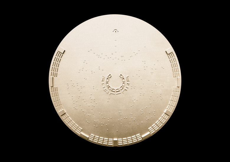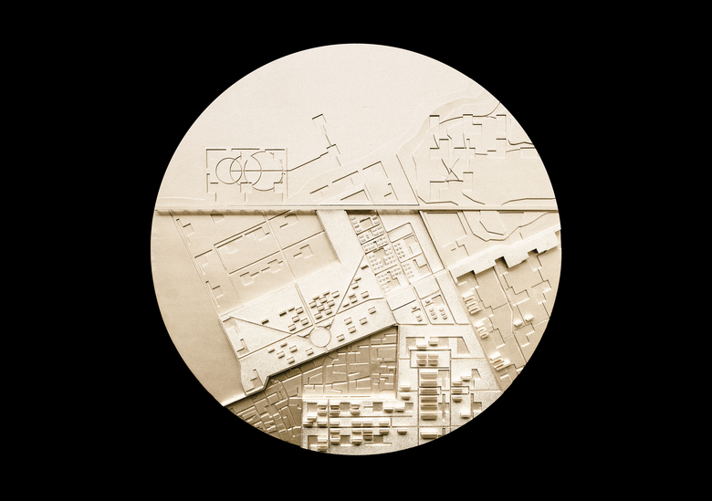 由于展览的五个城市为卡尔维诺般想象中的城市,为了在视觉上强调其虚幻性及漂浮感,团队对灯光及展架本身也进行了设计。为了弱化展架本身带来的重力感,底座被预埋在地毯下,并仅以一根2cm钢管作为支撑,当25个定制logo灯打开后,从模型边缘泻出的光投射在黑色地面上,如日食般形成一个个光圈,也进一步强化了场内氛围的虚幻性。