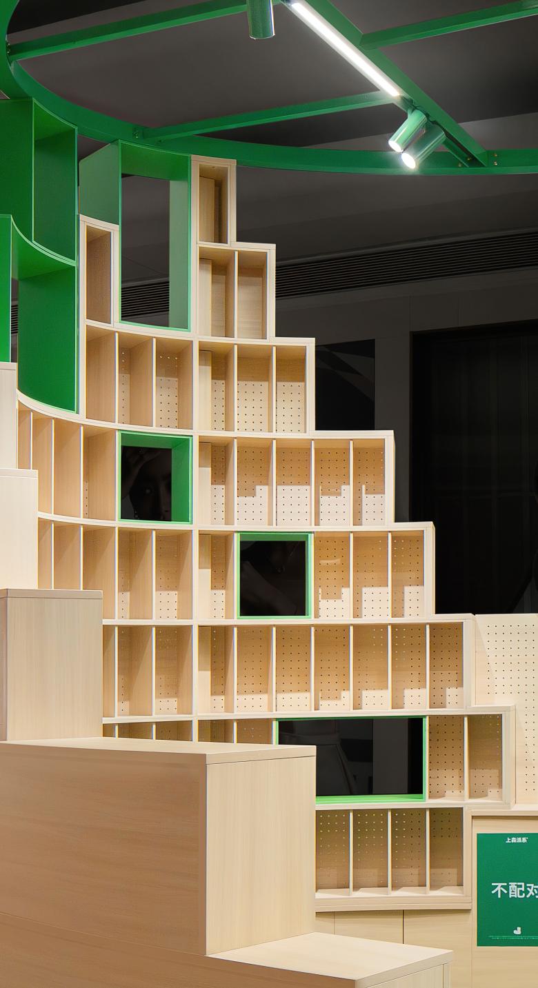 团队梳理了不同尺寸类型的SKU,将其错落地堆叠在中岛周围,以比拟层叠的植被剪影,花架则被转译为灯架,落在中岛之上。而品牌标示-绿色袜子花则被放大数倍,以方便吸引视线,其背面则恰好是个镜子,方便顾客试搭。