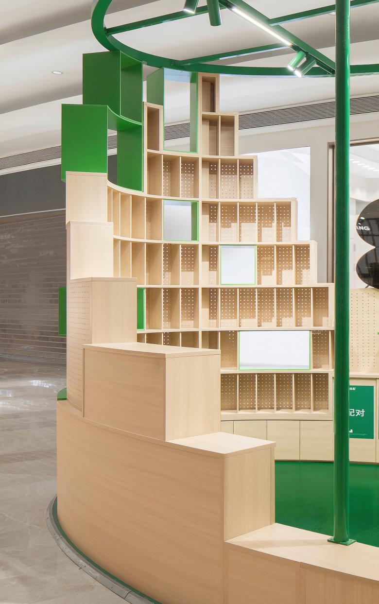 材料选择以白橡木,绿色PVC地板,绿色不锈钢板烤漆组成,以符合自然活泼的调性。电路则从异形钢管中穿越,为上方灯架提供电源。磁吸轨道则被埋入灯架中,可根据运营需求被替换为泛光灯或射灯。