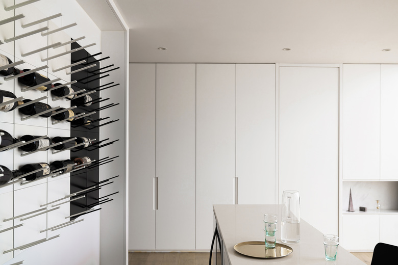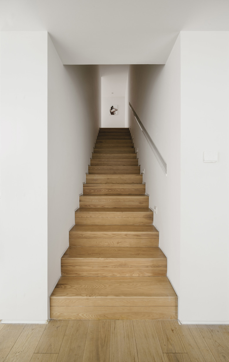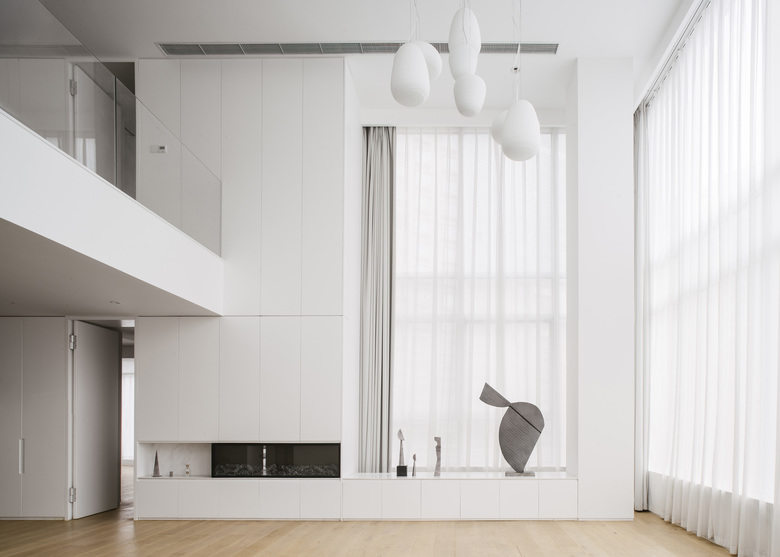 针对这套公寓的特质,〇筑设计采取了简洁克制的设计策略。设计首先压缩了大厅原有楼梯,将其改为单跑,进一步扩大客厅空间。而由此多出的面积则被拓展为一层的开放酒柜及二层家庭图书室。
