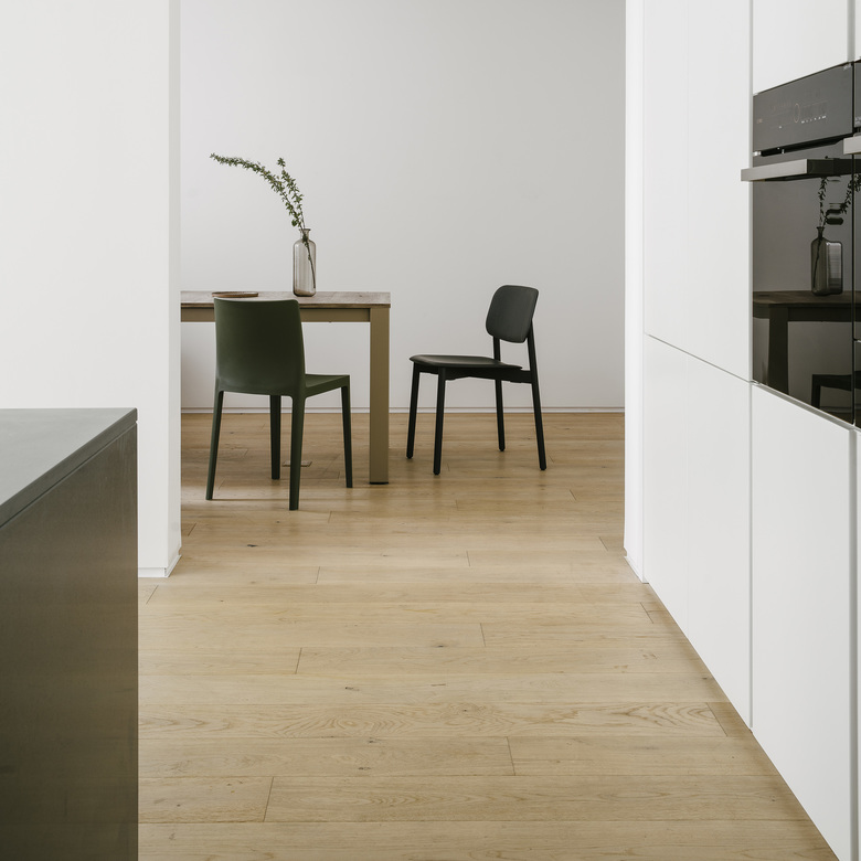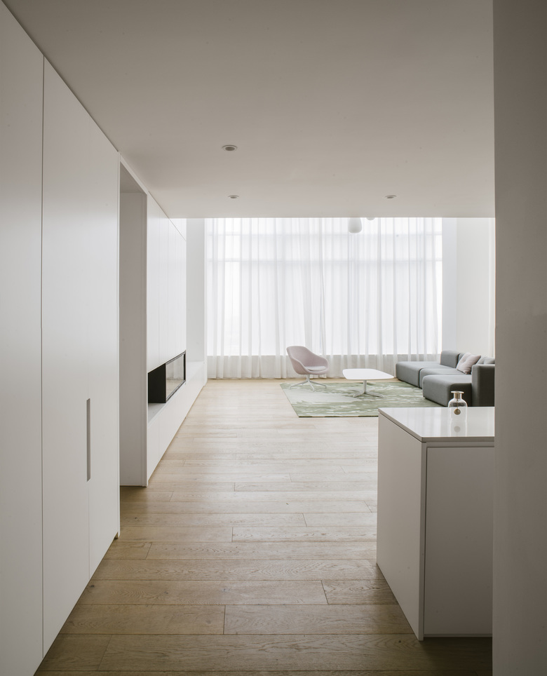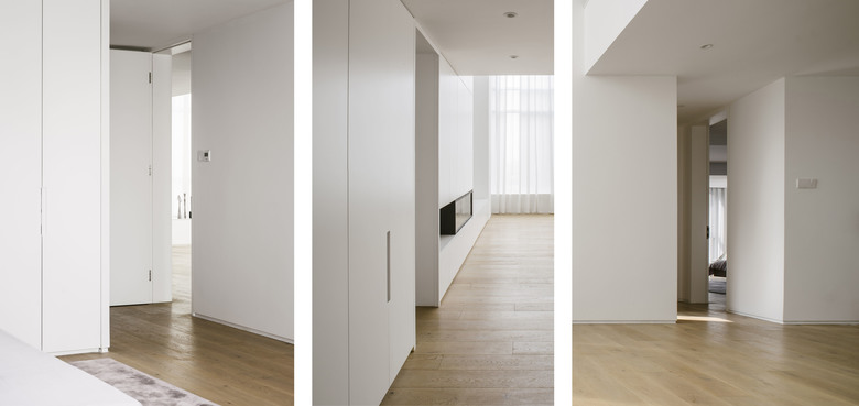 不必要的墙体及移门均被剔除,踢脚线,扶手等节点则被压缩至墙内。为避免视线遮挡,储物柜等均沿墙面布置,而高度较低的家具则被用来对各空间进行定性。针对于公共区域,我们则打通了多个出入口,形成可以在多个房间内穿行的流线,进一步强化其流通性。为保证用户在不同房间内穿行时的连续感,所有门设为通高且与天花齐平。