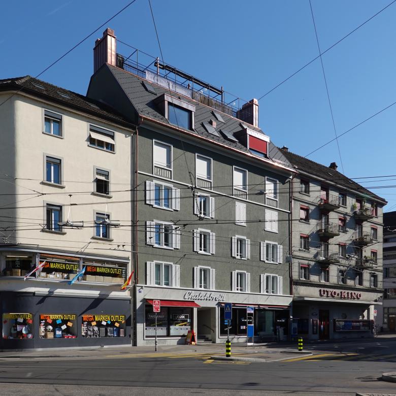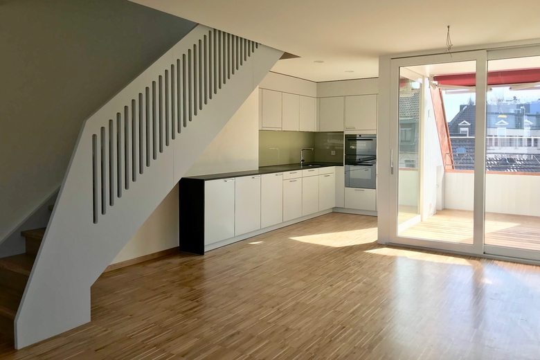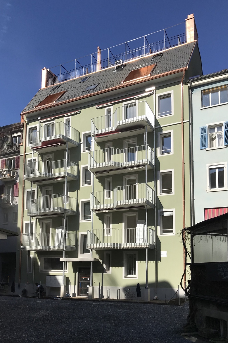 Umbau, Renovation und Aufstockung eines Wohn- und Geschäftshauses von 1895 mit acht Geschosswohnungen und zwei Maisonette-Wohnungen im Dach.
