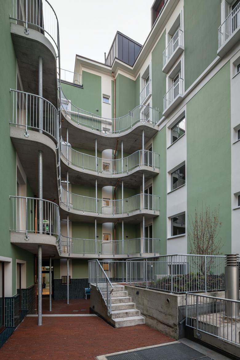 Das Wohnheim zwischen Molken- und Müllerstrasse wurde 1985 als Neubau hinter den bestehenden Fassaden von fünf quartiertypischen Wohnhäusern aus der Gründerzeit gebaut. Im öffentlichen Erdgeschoss befinden sich Empfang, Cafeteria und Restaurant, in den vier Obergeschossen bieten Wohnräume Platz für 84 Bewohner. Neben der Renovation der bestehenden Räumlichkeiten wird der Bestand um zwei Voll- und ein Dachgeschoss in Holzbauweise aufgestockt. Es entstehen dadurch zusätzlich drei 2-Zimmer- und drei 3-Zimmerwohnungen für neun weitere Bewohner sowie ein offener Arbeitsraum im Dachgeschoss für die Verwaltung.