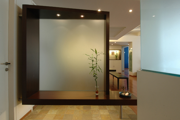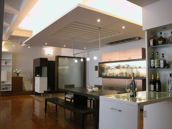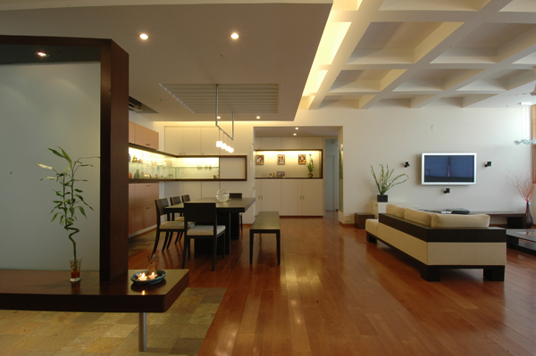 An apartment with a global soul- that is what the clients brief required. A large open hallway with a grid slab ceiling had to be modulated into four distinct zones to take care of the family needs. A raised teak wood platform that had a piano and a library formed one zone, a dining with a lowered ceiling height made the second, the third was meant for entertainment while the fourth was given to an entry vestibule. The project highlighted these four zones as distinct spaces forming the whole- but all flowing into each other visually and as space.
