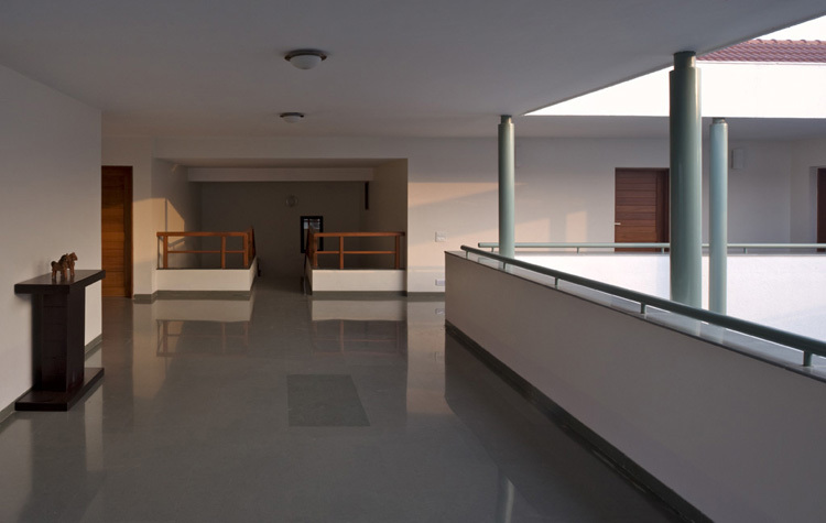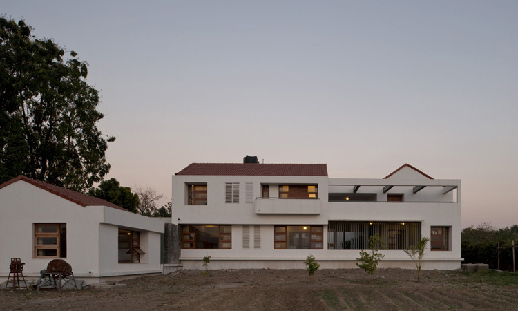 A village house set within interior Maharashtra for a head of an entire village (Sarpanch). The house had to accommodate a large joint family and had nine bedrooms, two living spaces, family spaces, large kitchen, a dining space, a prayer room, a home theatre and a public hearing space. This large program was housed around a central courtyard. The site also accommodated ten cows and buffaloes along with staff quarters. The local black stone of the Deccan was used as a feature throughput the house by making walls in one direction with this material. This material moved in and out of the house, defining interior and exterior spaces. The house uses solar heating, rain water harvesting while the kitchen is served by gobar gas.