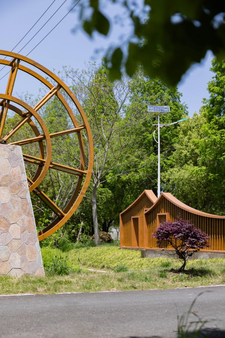 震泽村庄一般与乡镇道路相连,开车路过多是平平无奇,很多村庄甚至无法感知入口的存在。一个尺度适当的村庄标识能够营造起充分场地进入感,同时体现村庄特色。