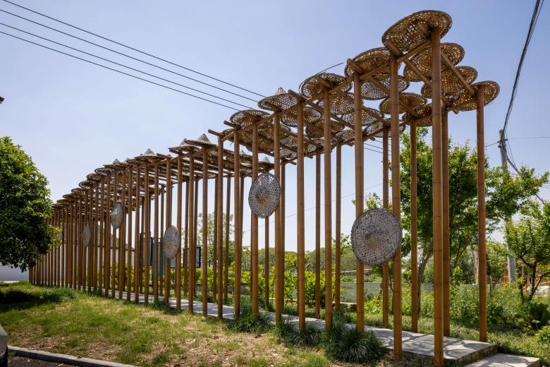 廊架呈波浪形,使用乡土材料搭建,连接河岸两侧空间,同时也成为了村子的“地标”。