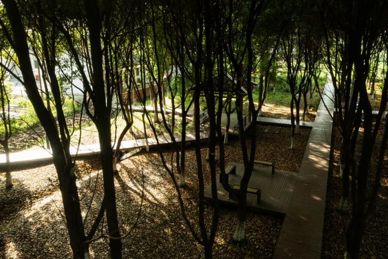 栈道位于村南部的樟树林,长期闲置,杂草丛生,沟渠积水脏臭。我们通过栈道贯通树林,方便村民通行,设置凉亭、座椅,形成一个舒适的林下空间。