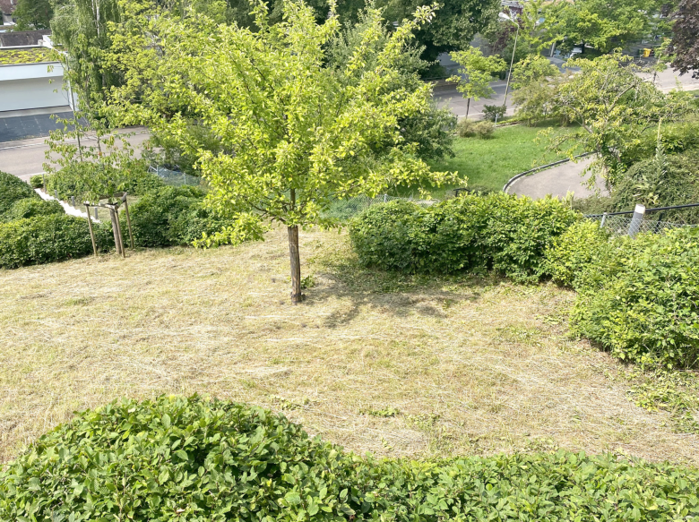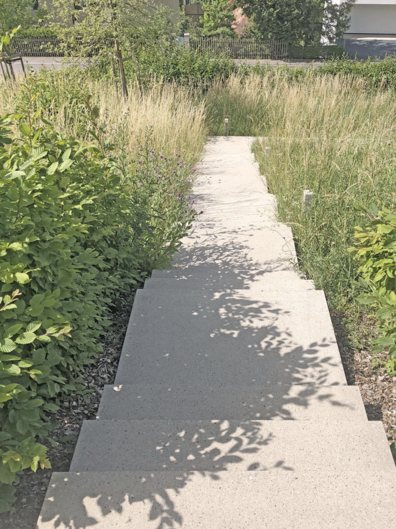 Das auf einer der letzten freien Parzellen, am Südhang des Lindberges in Winterthur realisierte Mehrfamilienhaus wurde geschickt in die Hanglage integriert. Weite, offene Grünflächen umfliessen die markante Baute, welche mit einer hellen Natursteinfassade verkleidet ist, und betten diese harmonisch in die Umgebung ein. Der natürliche Geländeverlauf zieht sich von der Rychenbergstrasse hoch zu den Rebbergen bis hin zum Bäumliweg. Attraktive Wildblumenflächen und amorph geschnittene, einheimische Hainbuchenwolken wechseln sich bis zu den bestehenden Rebanlagen harmonisch ab. Ergänzt mit verschiedenen Obstbäumen, teilweise ProSpeciaRara, wird dieses landschaftliche Bild zusätzlich verstärkt und setzt einen Bezug zum ehemaligen Bestand als lockerer Baumhain auf einer Magerwiese. Die gezielte Setzung der Hochstammbäume lässt den Blick aus den Wohnungen über die Stadt Winterthur gleiten. Ab dem Vorplatz mit Besucherparkplatz und der Tiefgaragenzufahrt führt ein streng geometrisch angeordnetes Wegesystem zum Hauptzugang, sowie weiter über einzelne Schrittplatten und einem Treppenlauf zum bestehenden, denkmalgeschützten Rebhäuschen. Auf die Materialisierung wurde grossen Wert gelegt. Die Betonplatten und Blockstufen wurden, wie weitere Elemente im Garten aus gestocktem Beton gefertigt. So sind neben dem markanten Mauerblock beim Eingang auch die wenigen Stützmauern und die Sitzplätze der Erdgeschoss Wohnungen aus gestocktem Beton realisiert worden. Eine schlichte Beleuchtung ergänzt die Umgebung.