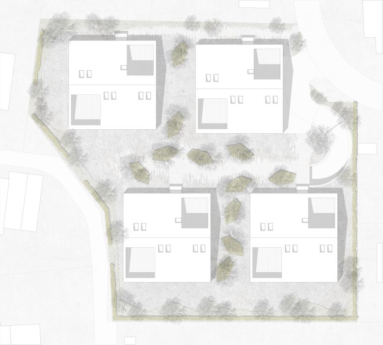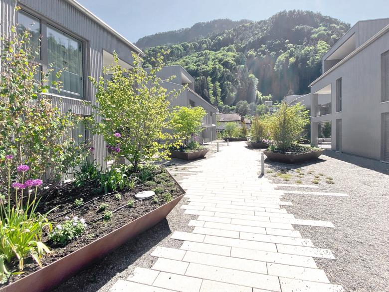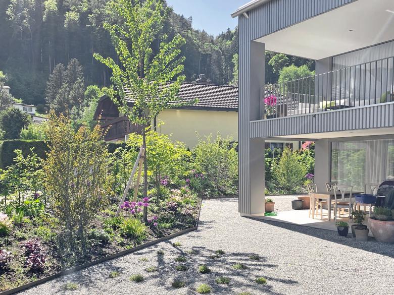 In Bad Ragaz wurde dieses Projekt im Jahr 2019, auf einer Parzelle innerhalb eines eher kleinstrukturierten Einfamilienhausquartiers, realisiert. Vier monolithische Mehrfamilienhäuser mit einer leicht futuristisch anmutenden Metallfassade, wurden in die bestehenden Gartenanlagen integriert. Der Freiraum, welcher mehrheitlich über der Tiefgarage liegt, wurde mit voluminösen, fünfeckigen Pflanzelementen aus Stahl, in Form von Kristallen begrünt. Durch die lose Setzung der Pflanztröge entstanden interessante Blickbezüge aber auch privatere, kleinräumlichere Situationen. Die gepflanzten mehrstämmigen, attraktiven Blütengehölze und die üppige Staudenunterpflanzung kontrastieren mit der eher monoton kiesigen Fläche, welche teilweise mit Thymian bepflanzt wurde. Die `ausfransende` fussläufige Erschliessung mit Betonbalken zu den Gebäudezugängen verzahnt sich mit der dominierenden Chaussierung mit feinem Rundkies. Blühende Staudenbeete und Hainbuchenhecken schliessen das Grundstück gegen aussen ab. Die gezielte Setzung von Hochstammbäumen lässt den Blick auf der Ostseite weit in die Berge gleiten. An der Gartenstrasse sind Besucherparkplätze und die Tiefgaragenzufahrt angeordnet. Eine schlichte Beleuchtung inszeniert die gelungene Aussenraumgestaltung auch nachts.