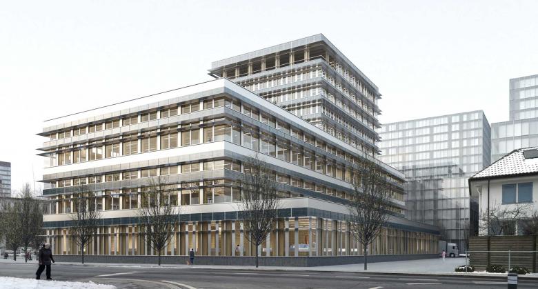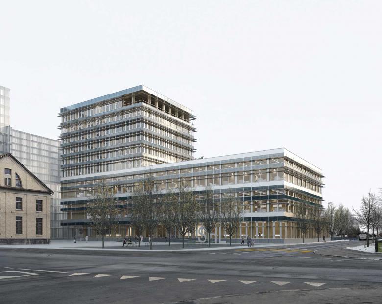 Das Büro- und Produktionsgebäude wird auf dem Areal des Tech Clusters Zug geplant. Mit seiner Staffelung vermittelt der Neubau zwischen den Massstäben der niedrigen Wohnbauten des alten Quartiers und den grossmassstäblichen Volumen des neuen Entwicklungsgebiets.
