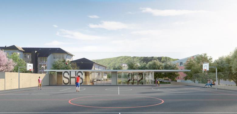 Schul- und Turnhallenvorplatz verbinden sich zu einem starken Schulplatz, zu dessen Wirkung eine divers gestaltete Begrünung des Umfelds beiträgt. Der entstehende Aussenraum dient primär als Pausenhof, kann aber auch für andere Veranstaltungen genutzt werden.