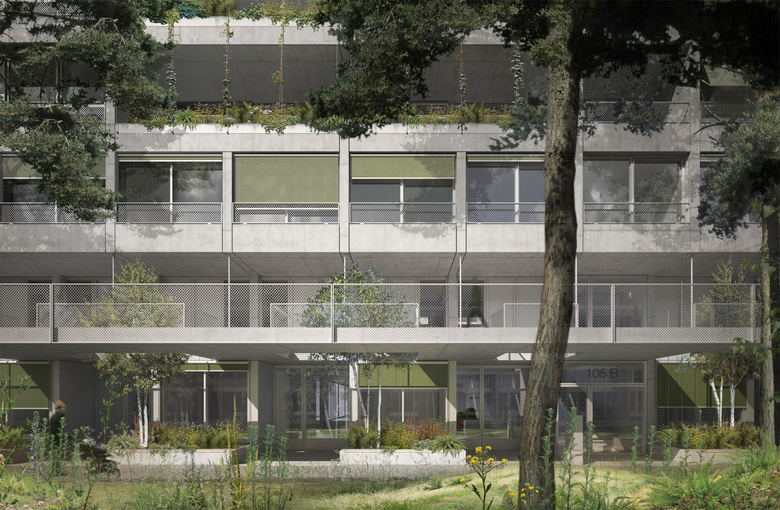 Die unterschiedlichen, höhengestaffelten Freiräume sowie die verdichteten und nutzbaren Grünräume im Erdgeschoss, die Dachflächen über dem 1. Obergeschoss, die Laubengänge entlang der Nordfassaden und die Dachflächen über dem 4.Obergeschoss werden intensiv begrünt. Als dichte Waldgärten werden diese einerseits Teil der Schwellen zwischen privatem Wohnen und öffentlichem Raum und erlauben andererseits ein räumlich gefasstes Angebot von nachbarschaftlichen Aufenthaltsorten ohne Beeinträchtigung des Privaten.