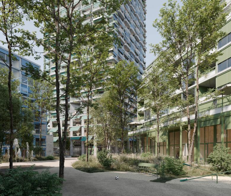 Durchlässige Freiräume vernetzen das Quartier mit der Umgebung. Private Terrassen, begrünte Zwischenbereiche und eine baumbestandene Mitte schaffen eine gestaffelte Übergangszone. Grosszügige Baumpflanzungen verleihen dem Quartier Identität, während ein markanter Baumkreis an der Überlandstrasse den Auftakt ins Viertel inszeniert.