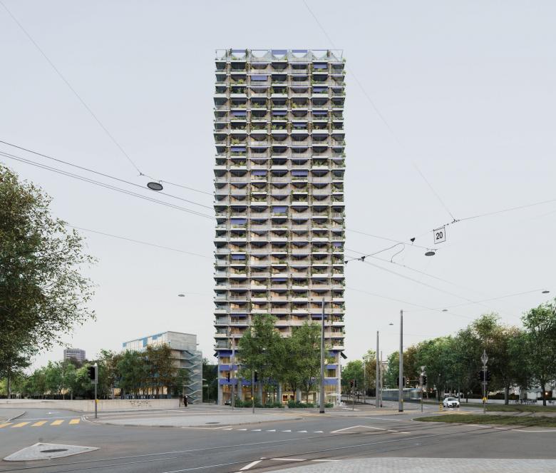 Mit modular organisierten Wohnungen und gemeinschaftlichen Flächen verankert sich das Hochhaus über einen Sockel mit Büro- und Gewerbenutzungen im Areal. Familienfreundlich gestaltet, fördert das Quartierhaus Begegnungen und ergänzt das Wohnangebot um Maisonette-Wohnungen mit Gärten. Während die Zeilenbauten an der Überlandstrasse Townhouses integrieren, kombinieren jene am Boulevard Gewerberäume mit Wohnen. Ein einheitliches Farb- und Materialkonzept verbindet die Gebäude subtil miteinander.