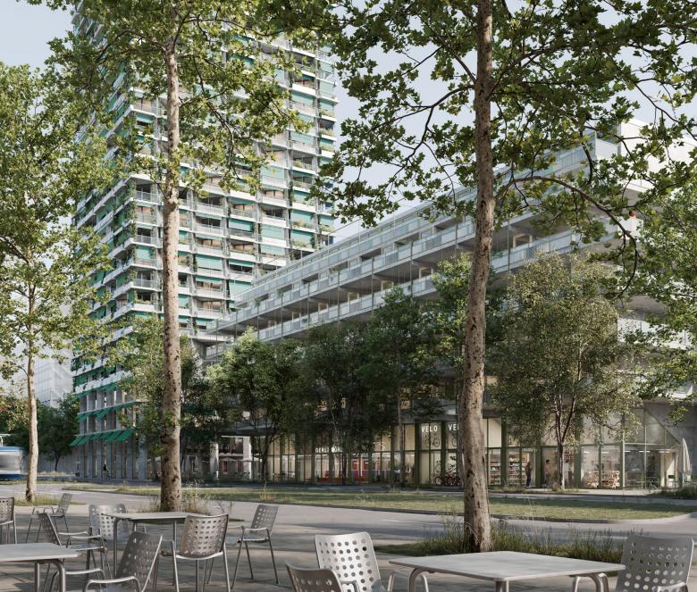 Das Projekt der ARGE Penzel Valier und ROBERTNEUN™ verbindet bestehende Strukturen mit neuen Grossformen in Dietikon. Ein 80-Meter-Wohnturm setzt einen markanten Akzent, während das diagonal gegenüberliegende Quartierhaus mit gestaffelter Höhenentwicklung den Stadtraum präzise ergänzt. Zwei Zeilenbauten entlang der Strassen fassen den Raum und schaffen städtebauliche Nischen mit fliessenden Übergängen zum öffentlichen Bereich. Der zentrale Garten bildet das Herz des Quartiers.