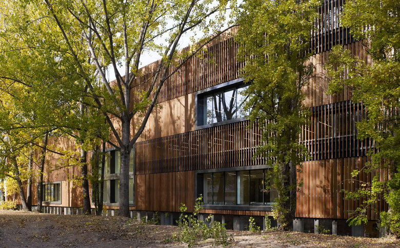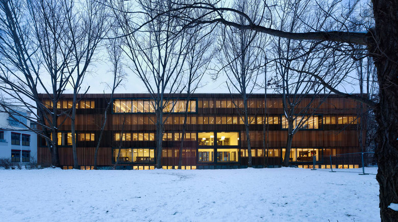 Die Unterkonstruktion der neuen Fassade besteht aus einem Holzrahmen, die über Stahlkonsolen mit dem Gebäude kraftschlüssig verbunden sind. Dieses "Fachwerk" ist mit mineralischer Wärmedämmung ausgefüllt und mit schwarzen Fassadenbahnen kaschiert, es tritt vollständig in den Hintergrund. Die vorfabrizierten Lamellenelemente aus Zedernholz sind an diese Unterkonstruktion montiert. Die vertikal angeordneten Lamellen sind in unterschiedlicher Schrägstellung ausgeführt, so dass ein changierendes Fassadenbild entsteht. Besonders in der Bewegung ergibt sich ein lebendiges Spiel. Gerade so, als bliese der Wind durch ein Gerstenfeld.