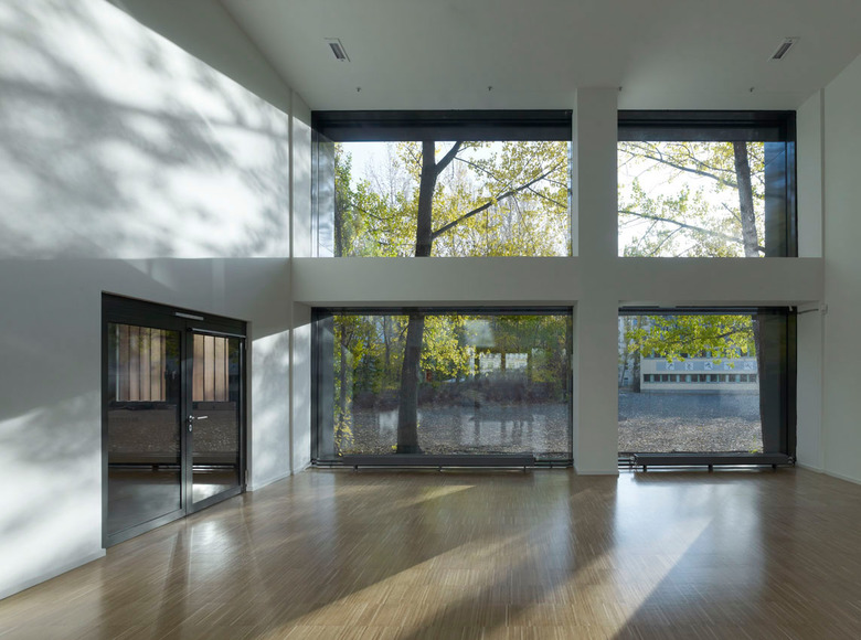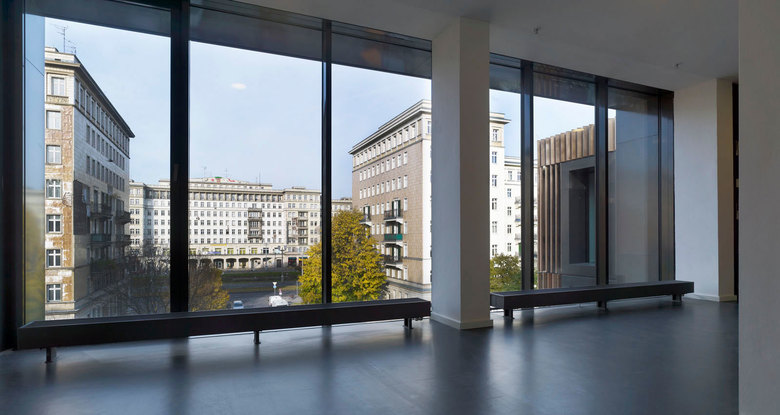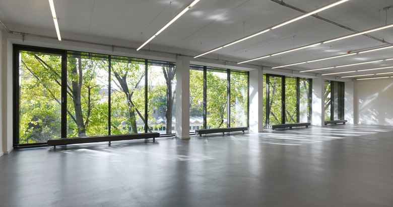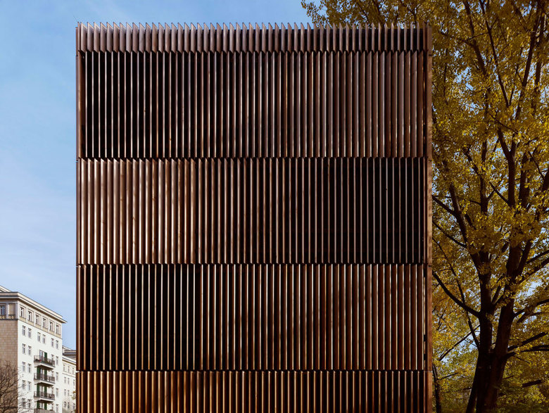 Im Innern offenbart sich ein spannungsvolles Wechselspiel aus Öffnungen mit und ohne Lamellenvorhang. Indem die Lamellen einen Teil des Blicks nach Außen verstellen, erzeugen sie eine kontemplative Atmosphäre. Gleichzeitig lässt sich durch den gerichteten Blick die Welt bisweilen neu entdecken. Im Kontrast zum gefilterten Blick stehen dann an bewusst gewählten Orten, der freie und großzügige Blick auf die Frankfurter Allee oder den weiten Hof mit seinen üppigen Platanen. Unterschiedliche Lamellenstellungen lassen das Licht in abwechselnder Intensität einfallen. Bei nächtlicher Innenbeleuchtung wirkt der scheinbar schwere Monolith an vielen Stellen transluzent, leicht und fragil.