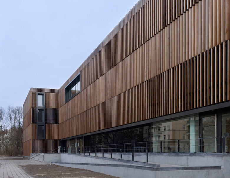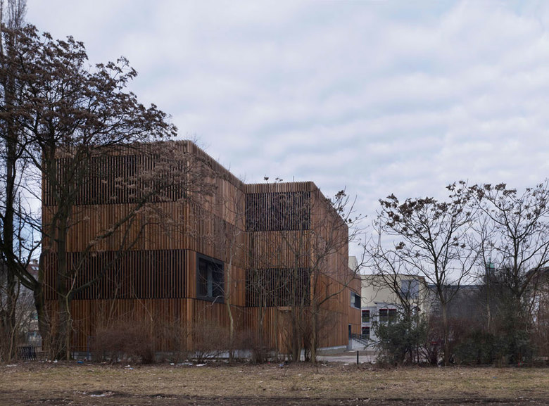 Das Gebäude impliziert durch die einheitliche Fassadenbekleidung einen monolithischen Charakter. Das Volumen wird als homogene Einheit gelesen und behauptet sich selbstverständlich im Stadtraum. Die Hülle aus geschosshohen Zedernholzlamellen lässt das Gebäude von der Frankfurter Allee her als prägnanten Solitär erscheinen. Zwischen den Bäumen der Stichstraße erhebt sich ein Haus, welches mit seiner Materialwahl auf den Standort in einem begrünten Blockinnenbereich reagiert. Die neue Gebäudehülle wird durch großzügige, raumhohe Öffnungen durchbrochen. Sie sind kompositorisch angeordnet, die Beziehung von Innen nach Außen wird für die Besucher wahrnehmbar. Durch die großen Öffnungen entsteht eine Dramaturgie von Aus- und Einblicken und eine besondere Belichtungssituation. Die Lamellen dienen gewissermaßen als Filter zwischen der Innen- und Außenwelt. Betrachtet man das Gebäude von außen, wird der Blick auf die wie Schaufenster wirkenden Verglasungen gelenkt hinter denen sich Bücherregale ausmachen lassen.