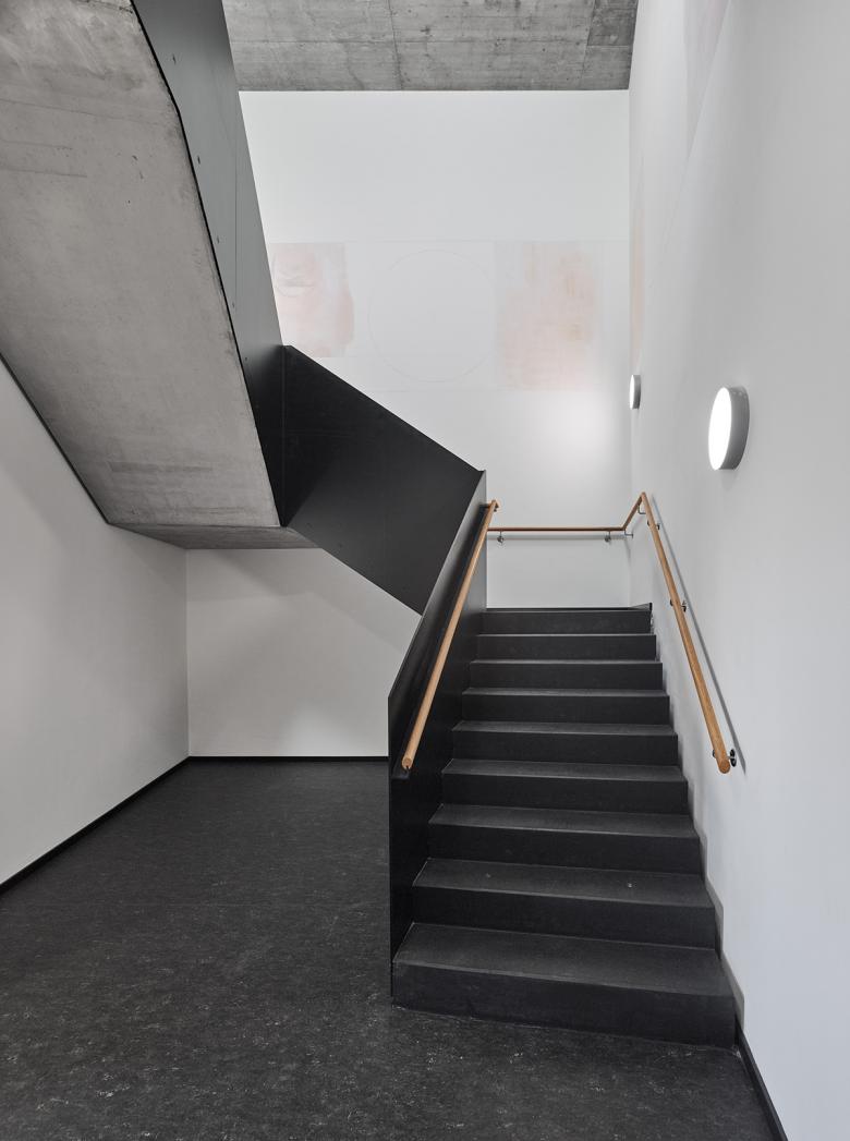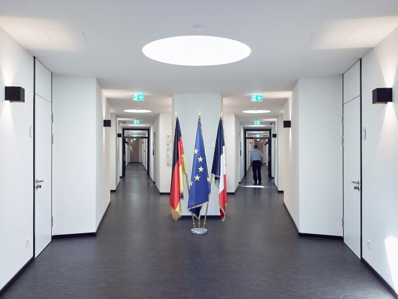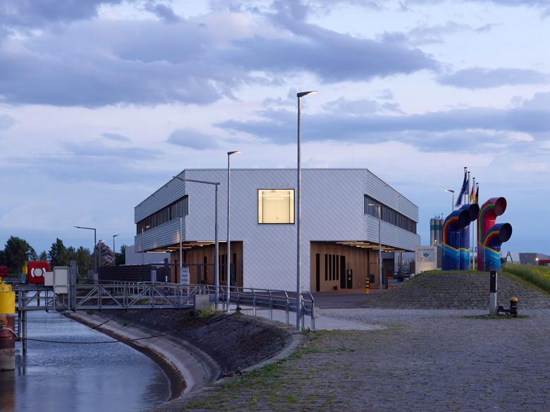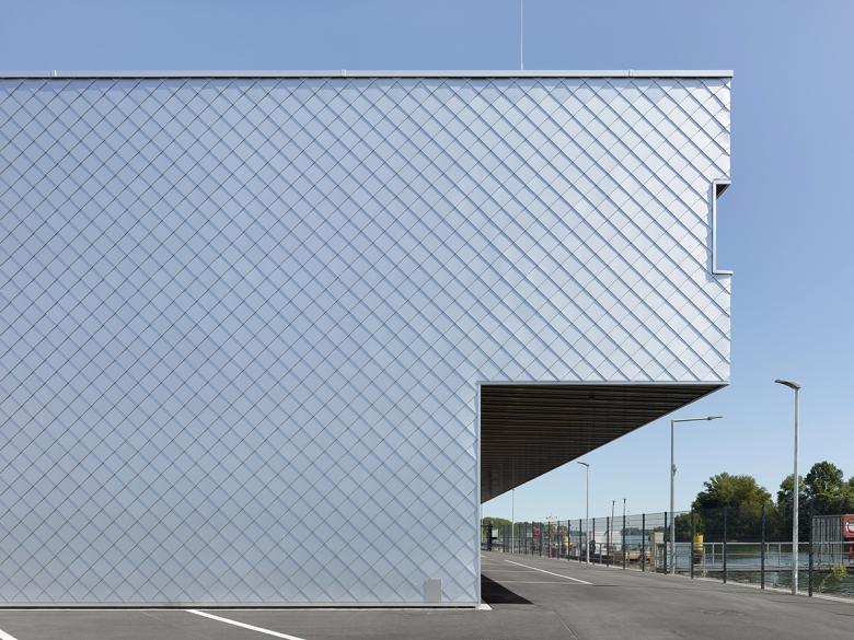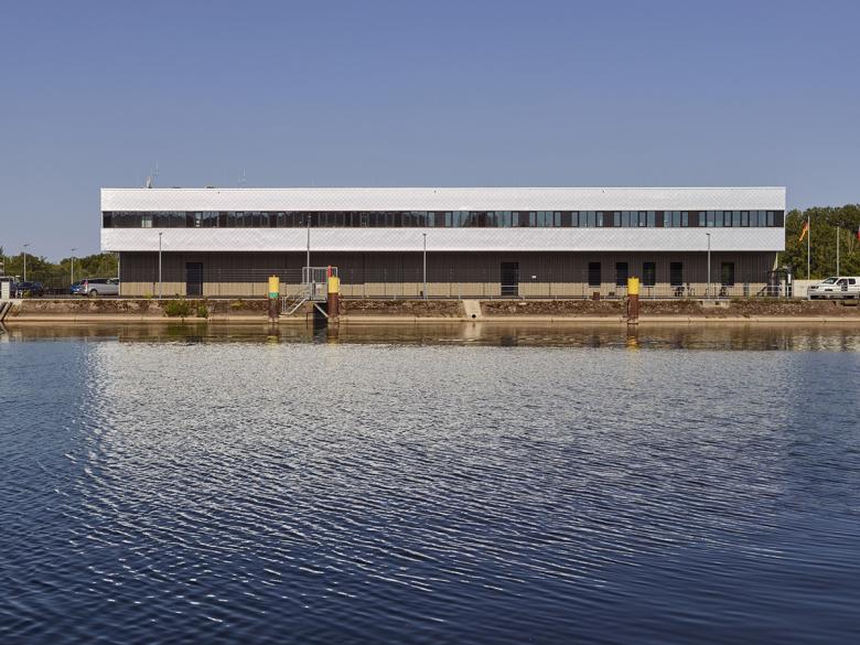 Der Neubau der Deutsch-Französischen Wasserschutzpolizei-Station befindet sich in einer exponierten Lage: Auf der einen Seite das von Brückenkränen umsäumte Hafenbecken, auf der anderen Seite der Rhein. Angesichts dieses Umfeldes wurde der Baukörper in Analogie zu gestapelten Containern ausgebildet, dessen Fassade sich beim Annähern jedoch als fein detaillierte Handwerksarbeit entpuppt. Die das Volumen umspannende Verkleidung aus silbernen Aluminium-Schindeln verleiht dem Gebäude einen chamäleonartigen Charakter: Während es in der Morgensonne rosa leuchtet, wirkt es mittags hell und scharfkantig sowie am Ende des Tages flimmernd. Gleichzeitig zeichnet sich das durch die Schindeln hervorgerufene Schattenraster je nach Sonnenstand in unterschiedlicher Stärke ab.
